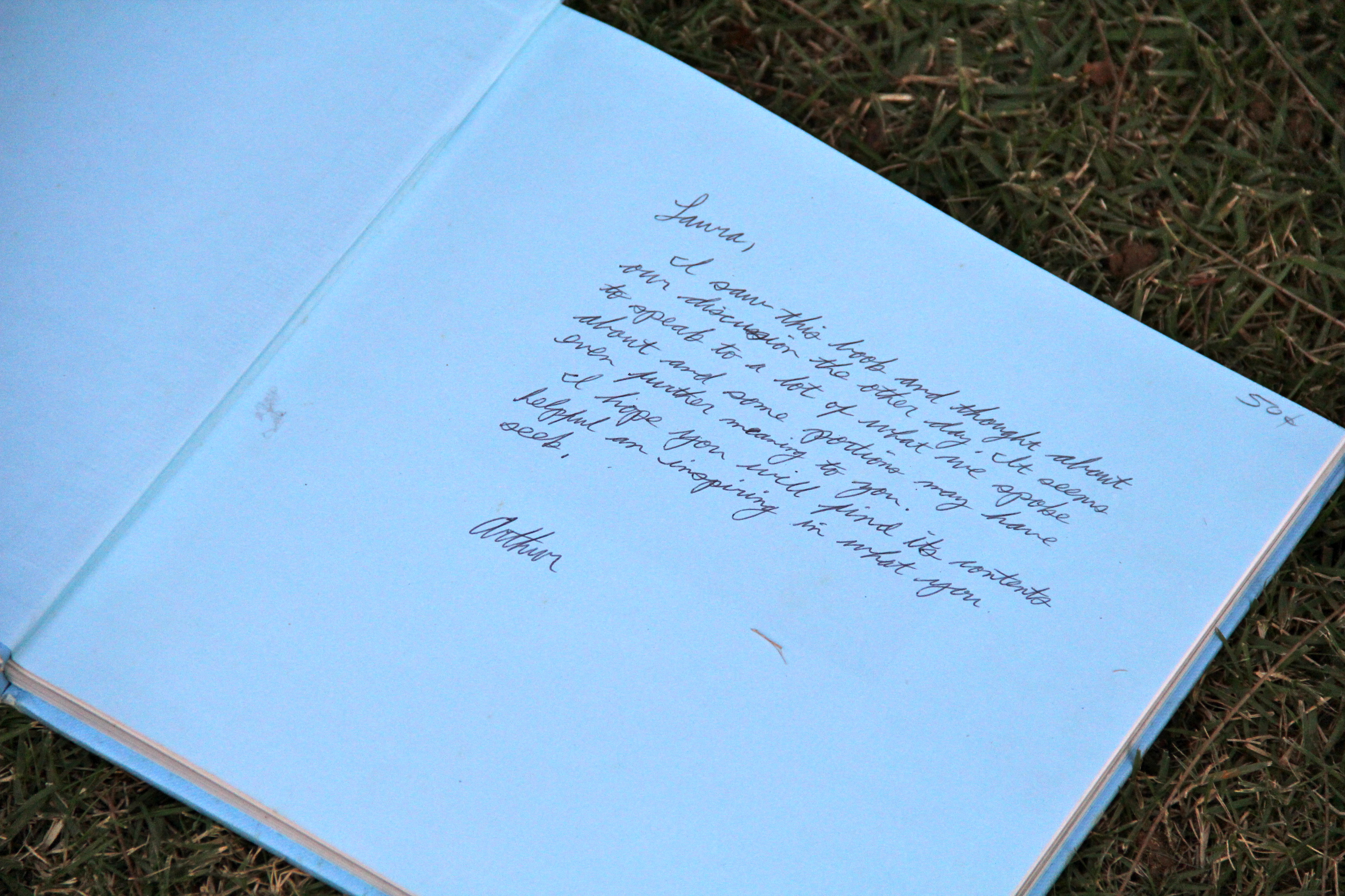 “Laura, I saw this book and thought about our discussion the other day. It seems to speak to a lot of what we spoke about and some portions may have even further meaning to you. I hope you will find its contents helpful and inspiring in what you seeks, Arthur”